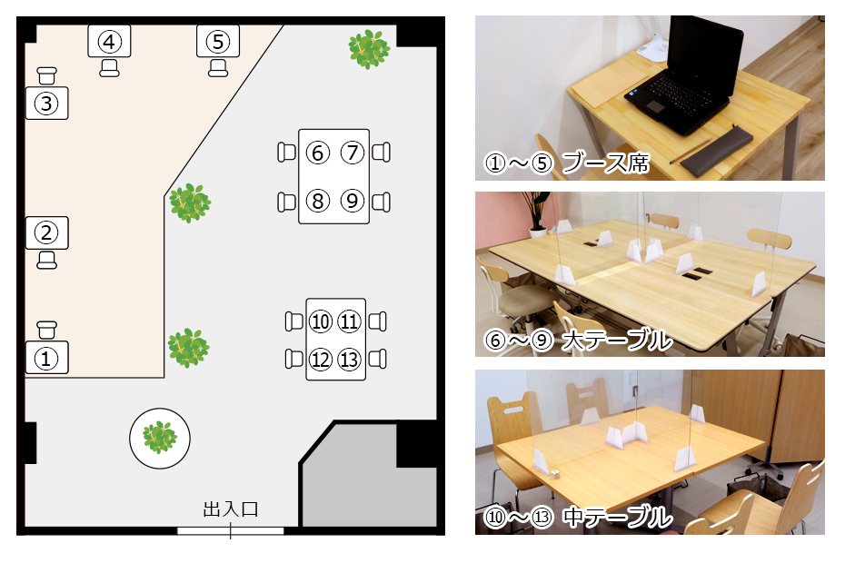 - 13席(個別ブース5席、テーブル席8席)要予約